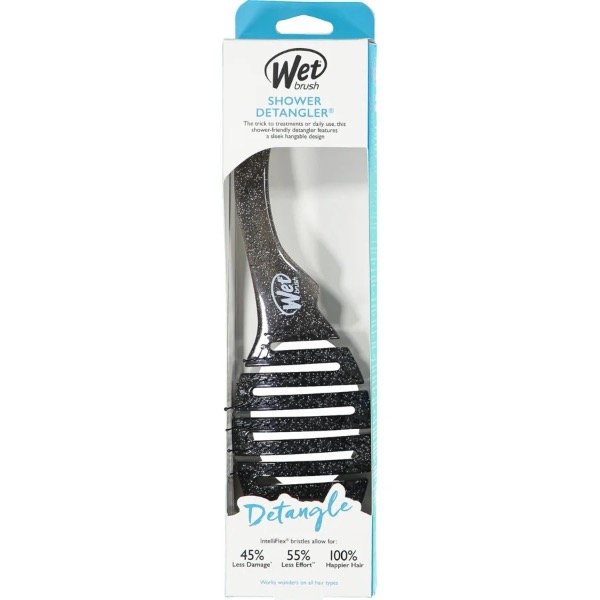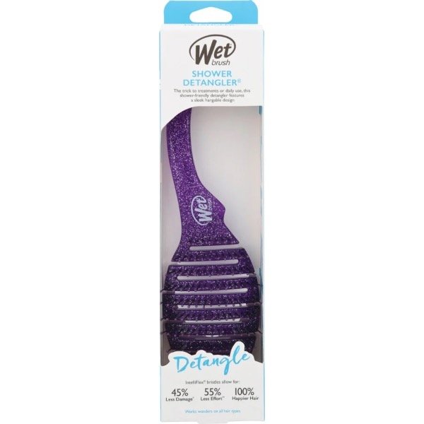 El cepillo Shower Glitter Detangler de Wet Brush hace que sea más fácil peinar suavemente el cabello tanto mojado como seco. Equipado con cerdas IntelliFlex, minimiza la rotura del cabello y las puntas abiertas. El mango ergonómico garantiza un uso cómodo.